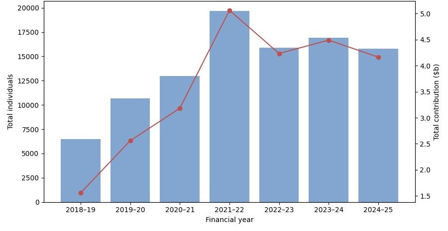 Yet, since peaking in 2021–22 when almost 20,000 people made downsizer contributions totalling just over $5 billion, both the number of contributors and the total value of contributions has declined. Last year 15,800 Australians took advantage of the scheme and contributed a total of $4.16 billion into super – the lowest number in five years.