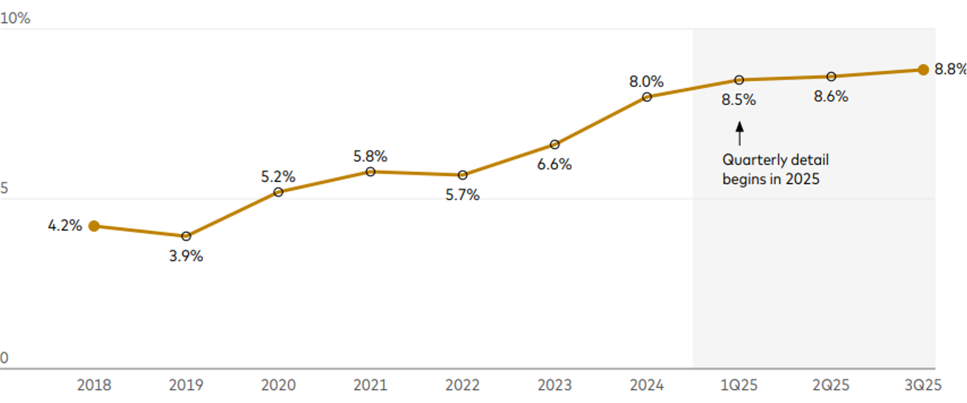 One such indicator is the use of payment‑in‑kind (PIK) interest, which allows borrowers to defer interest by adding it to principal. Intentional when included at origination, added later it can signify that cash is tight. In the direct‑lending market, PIK income averaged about 4.2% pre‑pandemic, rose to 7.4% post‑pandemic, and reached roughly 8.8% in the third quarter of 2025. Persistent increases have historically coincided with borrowers seeking to conserve cash. PIK also matters for public business development companies, which must distribute most taxable income even when that income is non‑cash.